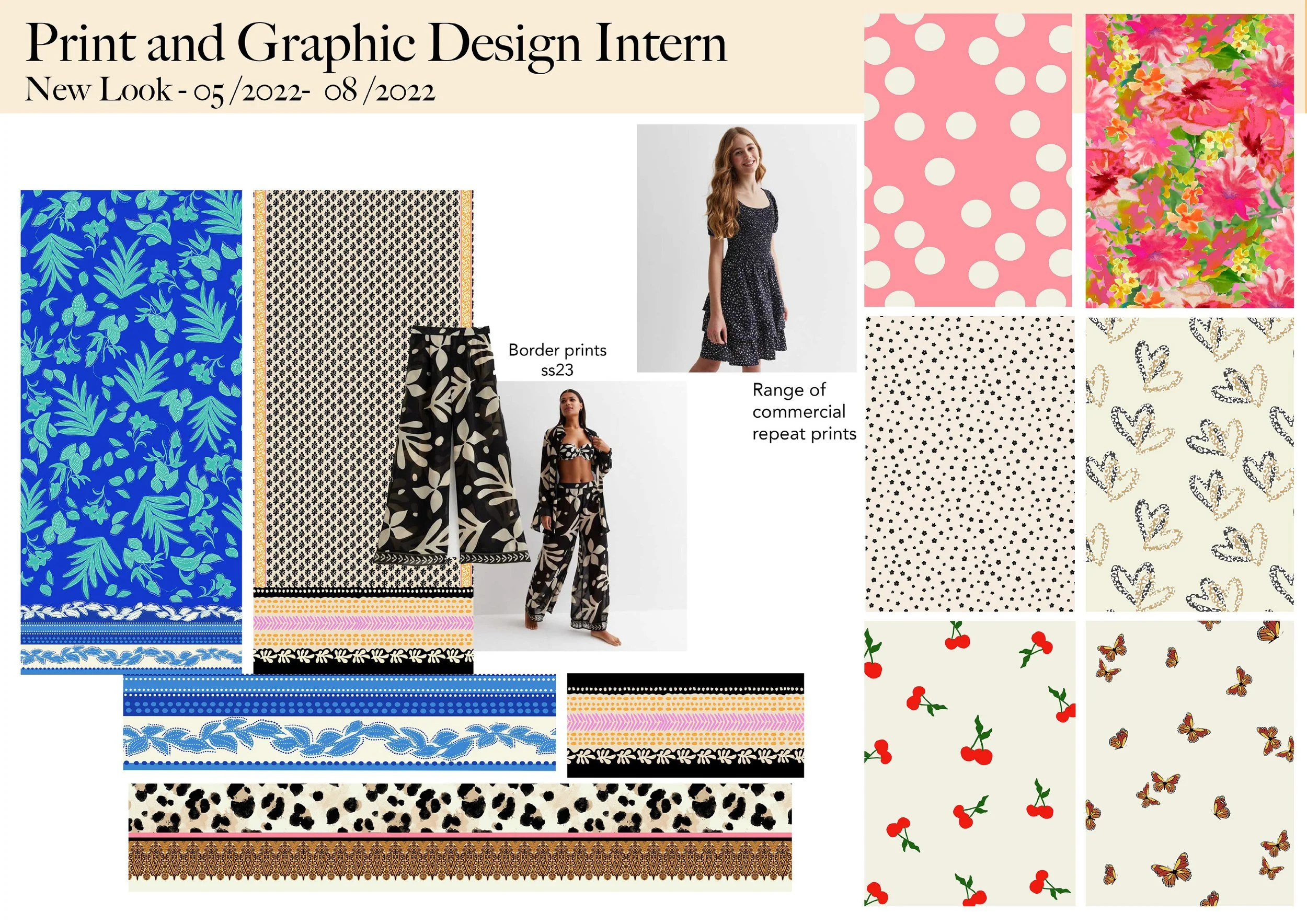 I spent 3 months as a print design intern at high street retailer New Look. Here I developed the foundational skills of print design including creating original artwork, repeat prints, matching Pantones, and sending specs to factories. I also completed an internal project for them centring on festival designs for ss23.